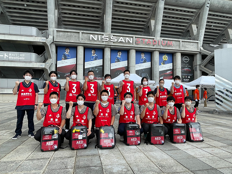 ホームゲームで巡回している日本体育大学保健医療学部救急医療学科の皆さんによるAED体験会を実施。