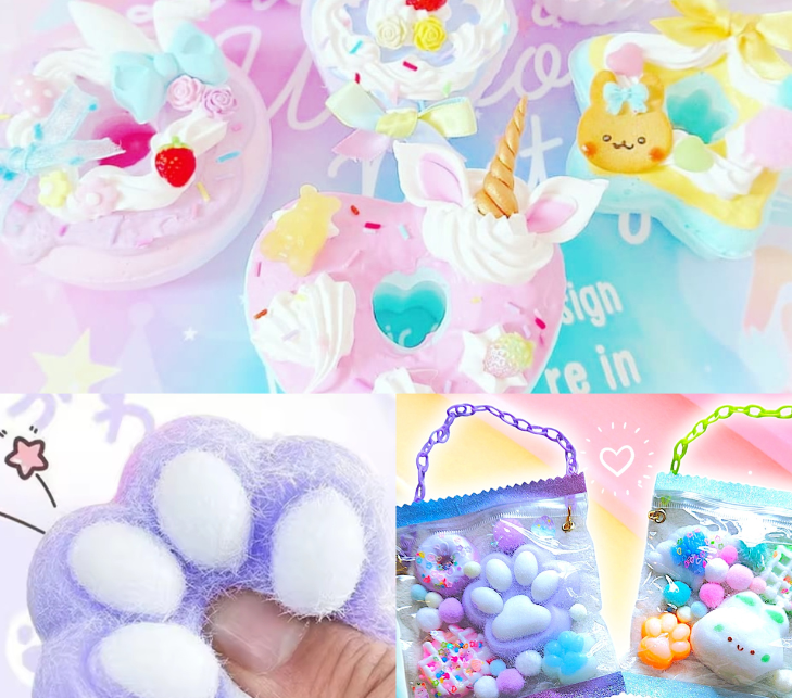 もちもちぷよぷよぺたぺた触感のスクイーズで可愛いバッグチャームを作ったり、ふわふわもちもちスクイーズをデコレーションするワークショップです