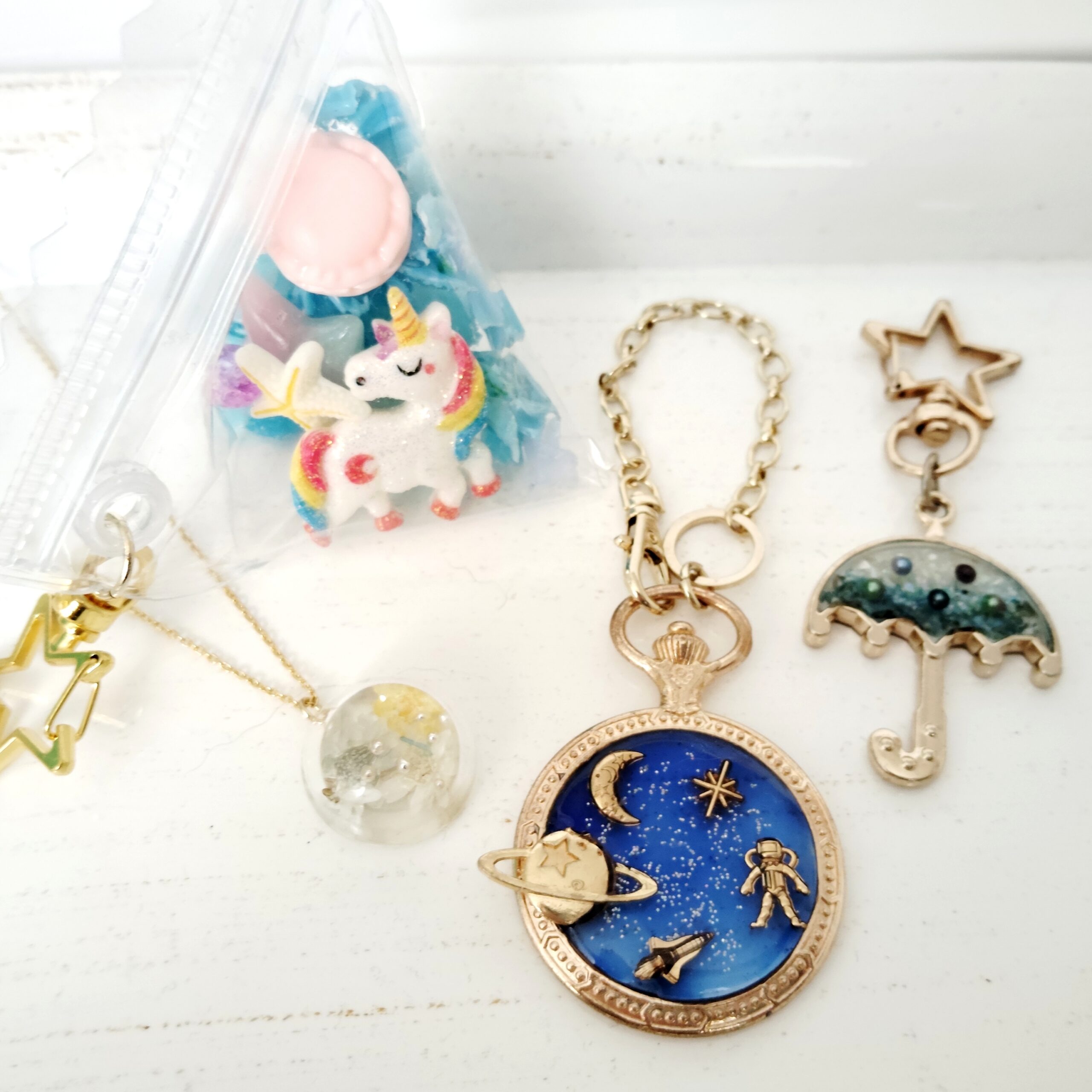 レジンで宇宙レジンのバッグチャームやキーホルダー、本物のお花を入れて作るネックレスを作るワークショップです。お子様から大人まで、初めての方でも可愛いアクセサリーが作れます!