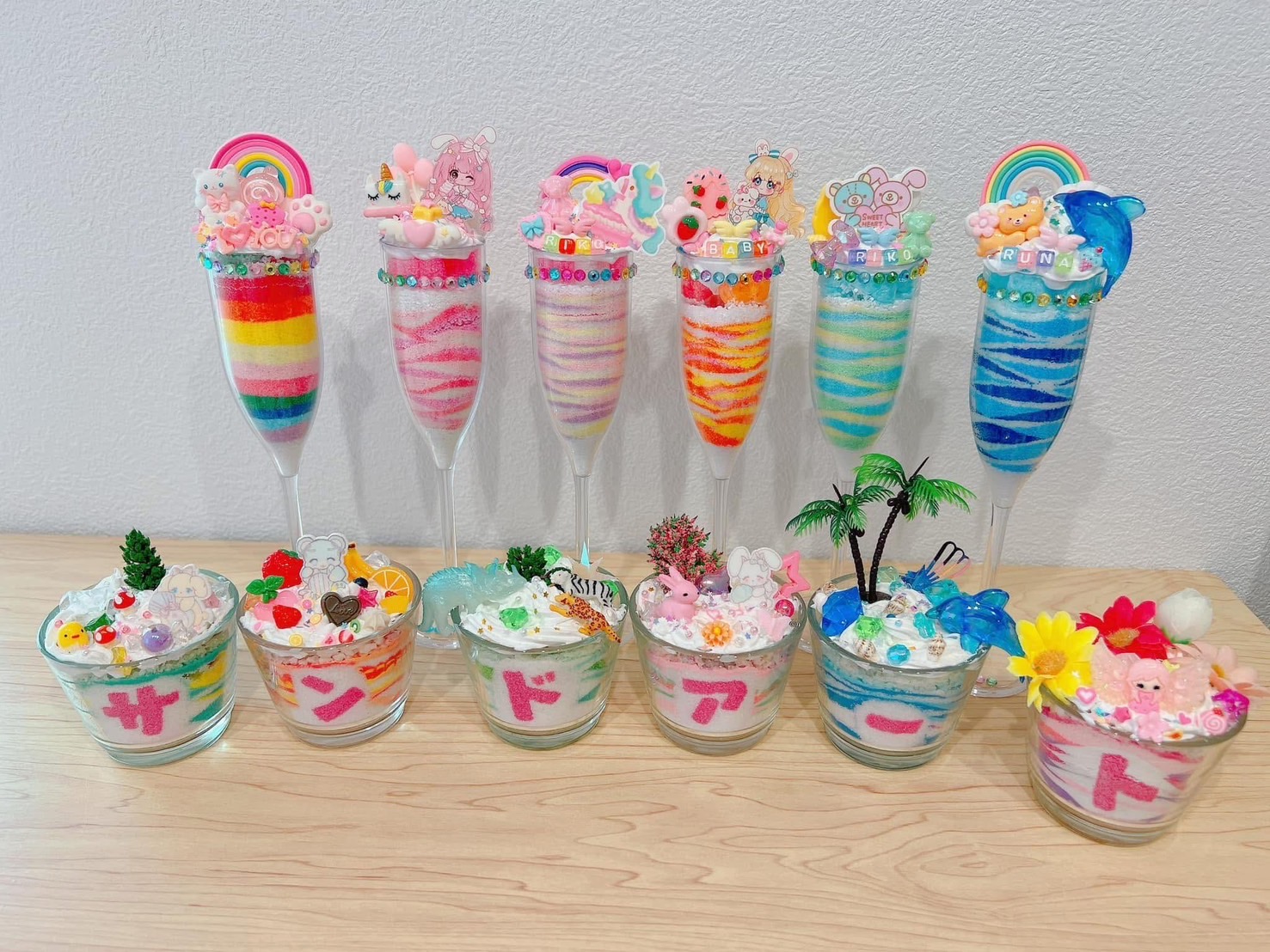 サンドアートの上にホイップをしたパフェや食品サンプルクレープキーホルダー作り