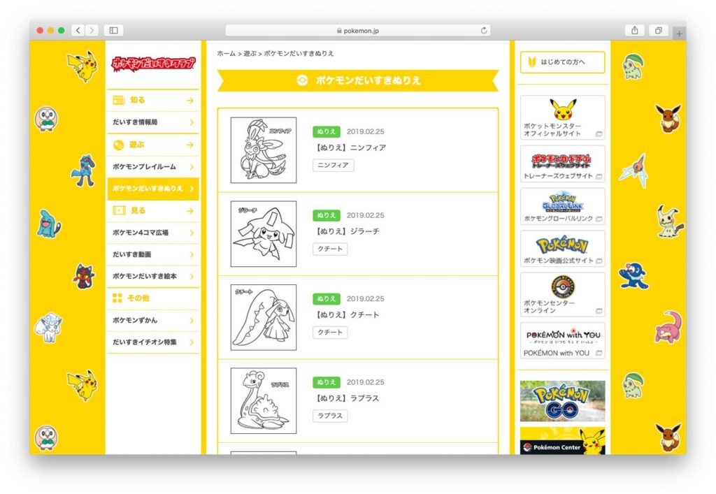 ピカチュウやイーブイなど人気のポケモンから、ちょっとマイナーなポケモンまでたくさんのキャラクターのぬりえがたくさん揃うのが「ポケモンだいすきクラブ」。ほかにもゲームや動画など楽しいコンテンツがいっぱい!