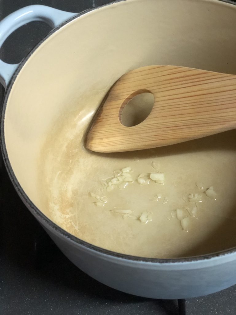 3.にんにくの香りがしたら玉ねぎを加え透明になってきたら鶏肉を加え炒める