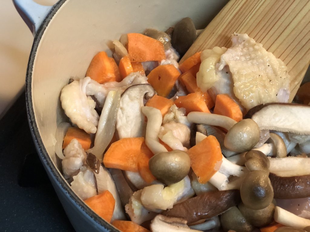 4.火が半分くらい通ったら人参・きのこ類を加え炒める
