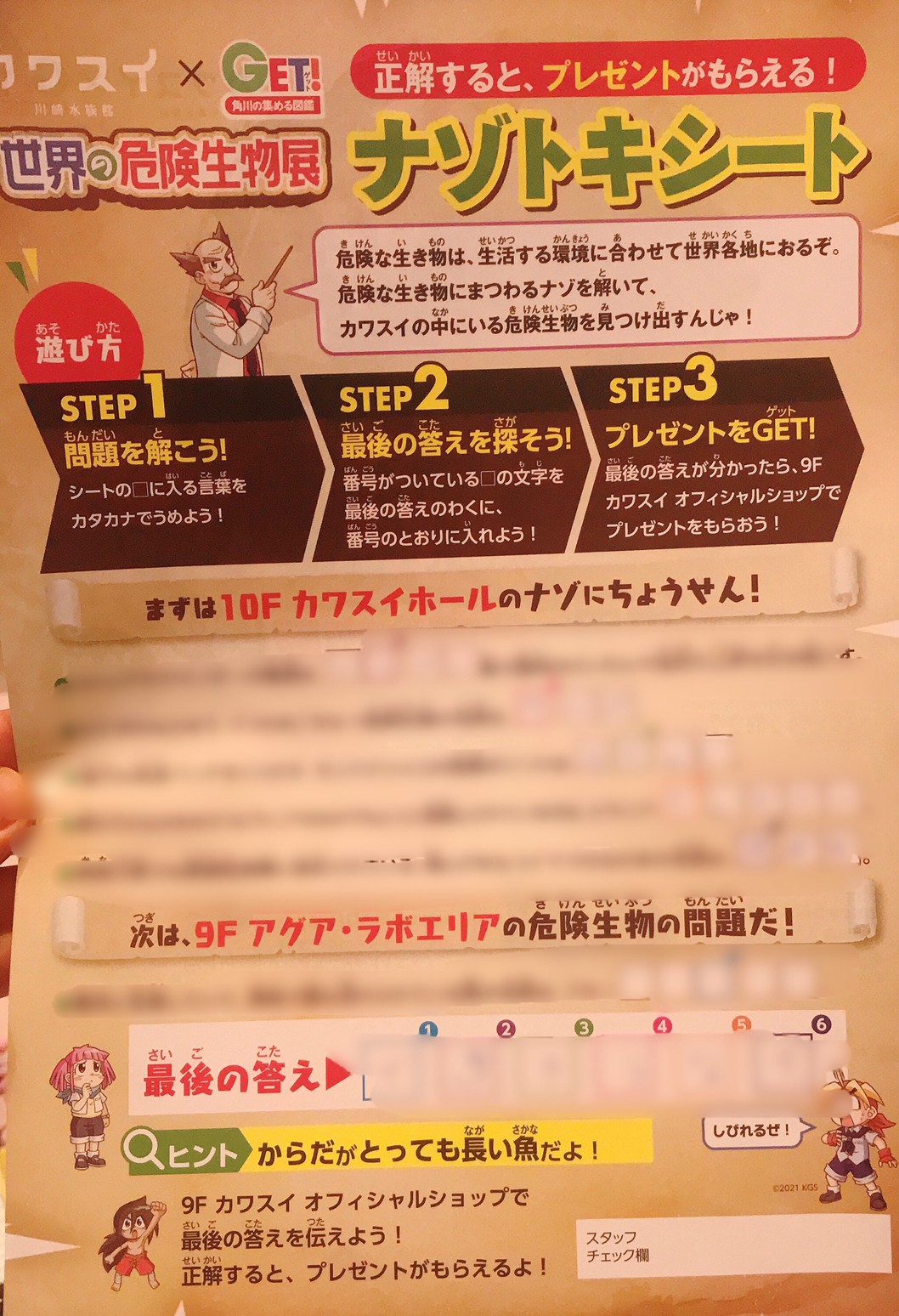 カワスイホールの巨大図鑑を見て危険生物たちのナゾを解き、9階カワスイオフィシャルショップに持っていくと、非売品のプレゼントがもらえるそう!ぜひチャレンジしてみてください。