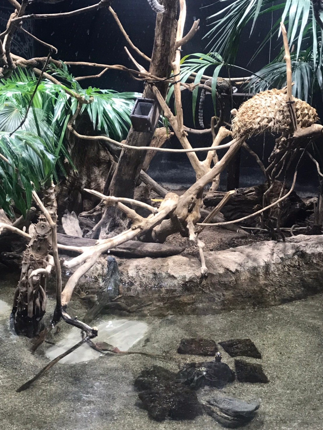 南アメリカゾーンでは、サルとイグアナとカメと魚が一緒に展示されていてビックリしました。(写真の中にいます。見つけられますか?)