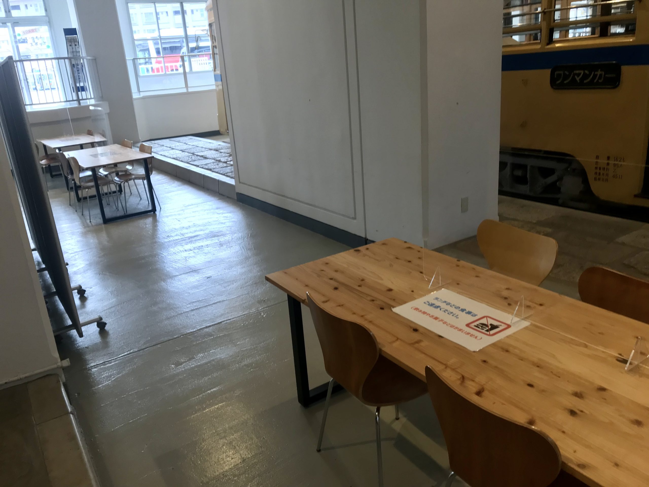 現在はコロナ感染症対策につき食事はできませんが、飲み物やおやつは持ち込んだものや自動販売機で購入したものは食べられるようです。コロナ感染症対策については横浜市電保存館の公式ホームページに載っていますので随時ご確認ください。