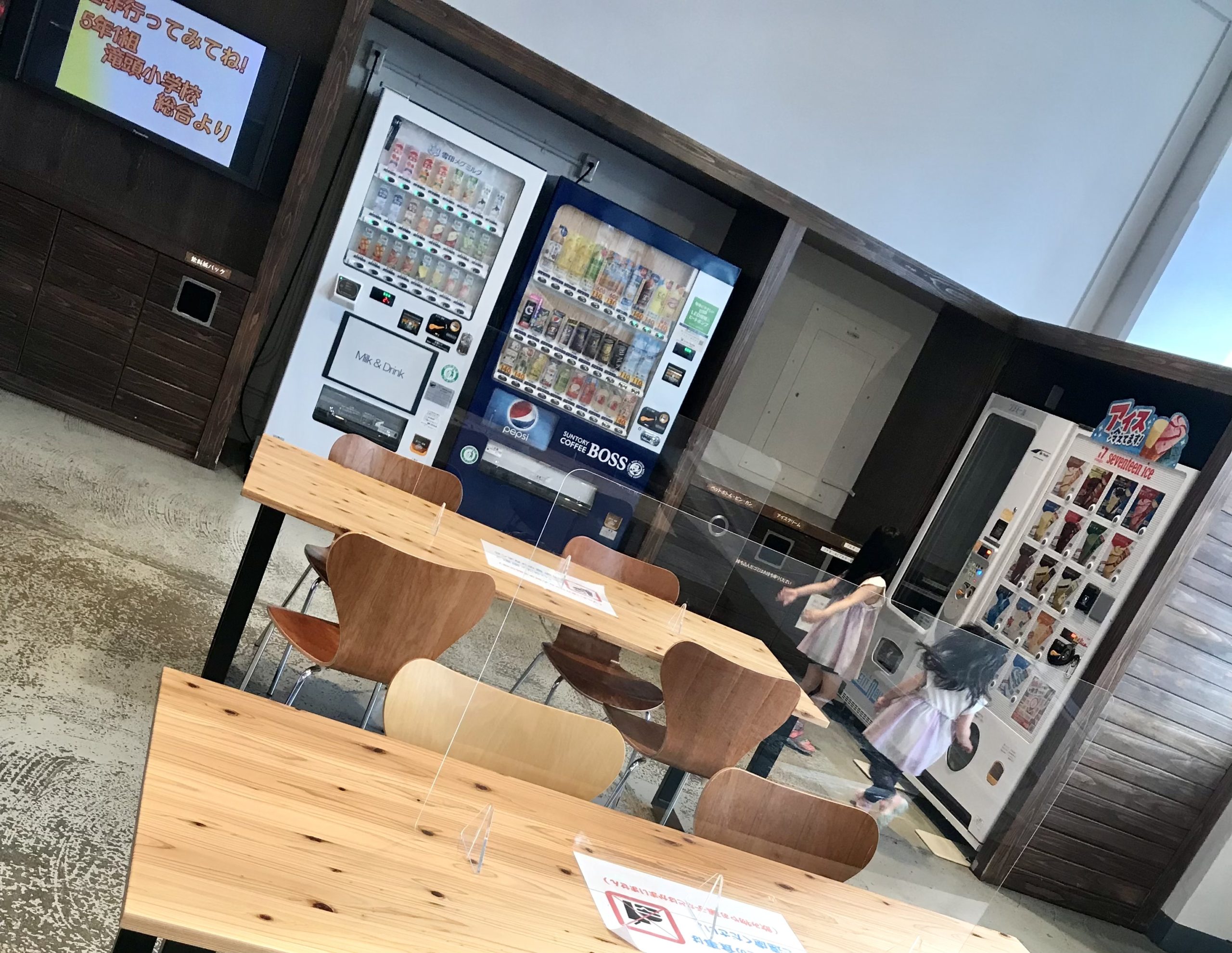 車両展示コーナーとジオラマコーナーの間にある休憩スペースでは飲み物やアイスやおやつの自動販売機があります。