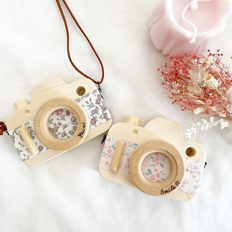 布を選ぶわくわく、おしゃれなカメラをお子さんが肩に
